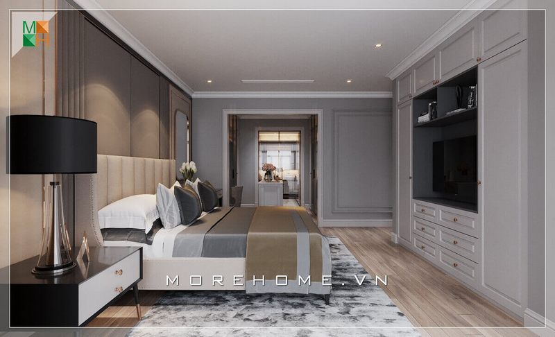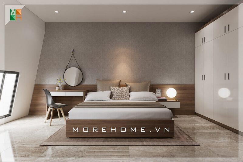 Thiết kế phòng ngủ có bố trí nội thất đơn giản, hiện đại không rườm rà cầu kì nhưng tiện lợi và sang trọng độc đáo cho không gian biệt thự, nhà phố.