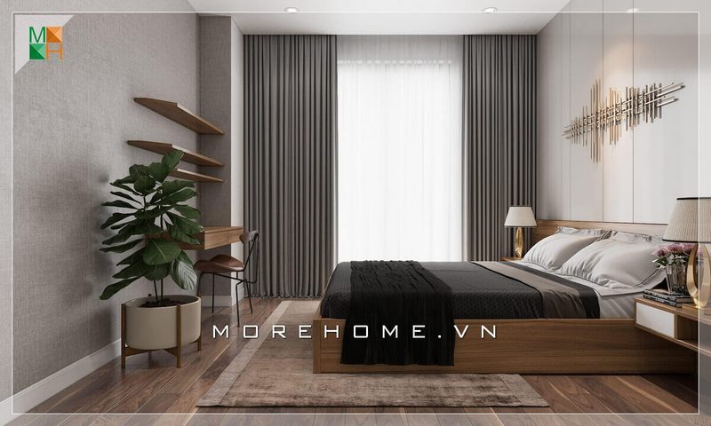 Nếu bạn là người mệnh Thổ hay mệnh Kim thì mẫu thiết kế nội thất phòng ngủ sử dụng gam màu nâu chủ đạo sẽ là gam màu khá phù hợp. Thể hiện nổi bật trong toàn bộ vật liệu đường ngôi nhà, từ sàn gỗ, giường ngủ gỗ, bàn trang điểm gỗ, kệ để đồ gỗ cùng chi tiết nhấn màu gỗ trên trần thạch cao và rèm.