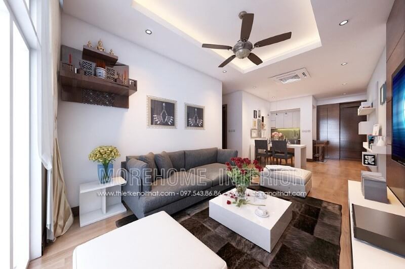 Mẫu bàn trà sử dụng gỗ công nghiệp với kiểu dáng bắt mắt đem đến sự nhẹ nhàng cho phòng khách chung cư.