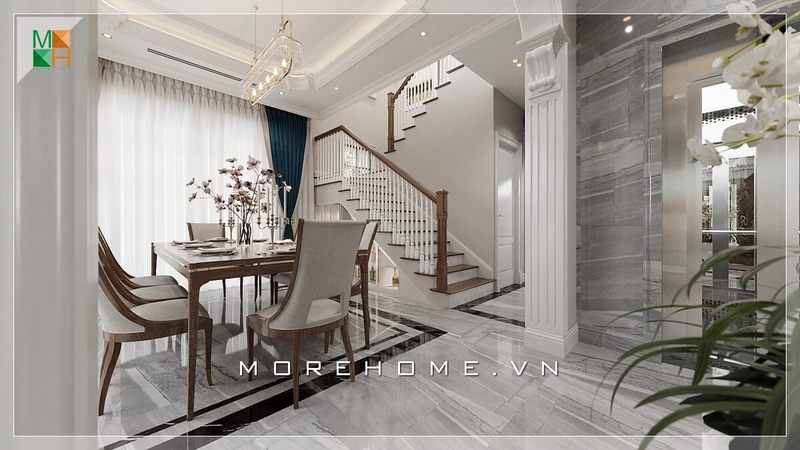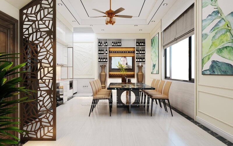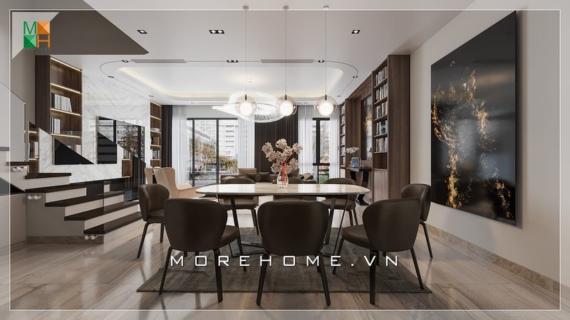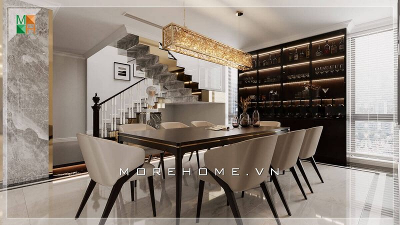 Không chỉ là nơi để mọi người thưởng thức những tinh hoa ẩm thực từ người mẹ, người vợ, người bà,.. mà còn là nơi để gia đình vun đắp nên mái ấm hạnh phúc. Việc chú tâm vào bố trí một không gian phòng ăn biệt thự lại càng được chú trọng để tạo nên điều kiện tốt nhất cho tất cả mọi người trong gia đình. Việc trang trí, lựa chọn đồ nội thất hợp với lối sống, gu thẩm mỹ và bố trí ánh sáng lại ngày càng được chú trọng. Tùy từng sở thích của mỗi mái ấm mà sẽ có những ý tưởng bố trí nội thất phòng ăn phù hợp chẳng hạn với mẫu thiết kế nội thất không gian phong cách hiện đại trong biệt thự Vinhomes Imperia Hải Phòng. Chất liệu gỗ đặc biệt là gỗ óc chó được thể hiện liền mạch dọc tầm nhìn khi vào từ phòng khách, chiếc bàn gỗ óc chó nguyên tấm, mẫu ghế bọc da sử dụng khung gỗ óc chó, dóng sang hai bên là tủ bếp gỗ óc chó, cùng kệ để đồ bắt mắt.