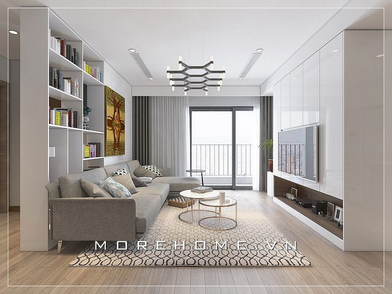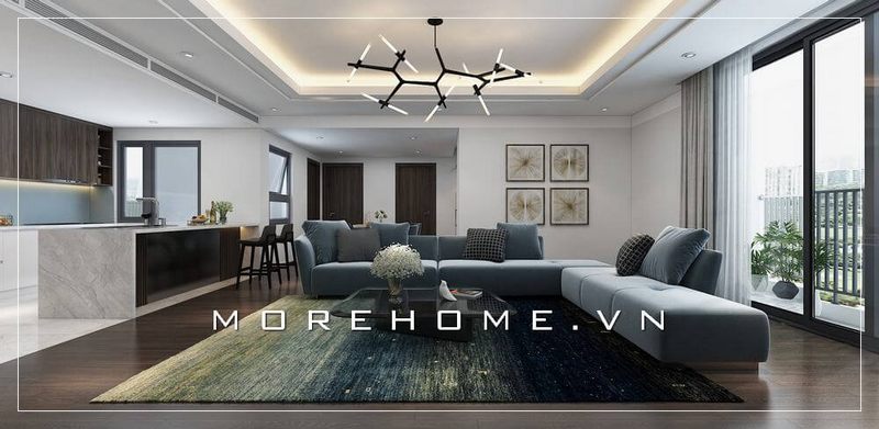 Bộ sofa đẹp màu xanh ghi tạo điểm nhấn nổi bật trong mẫu thiết kế phòng khách chung cư sang trọng này.