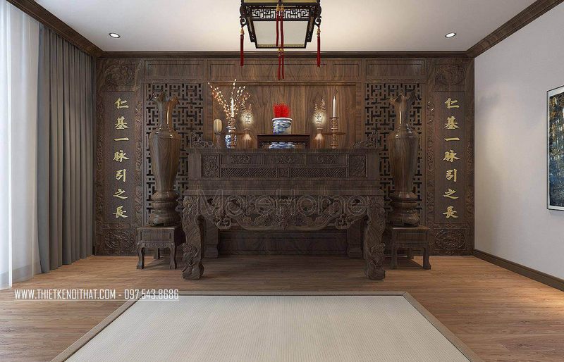 Tủ thờ kết hợp vách ngăn gỗ đẹp tạo nét trang trọng cho phòng thờ chung cư, biệt thự, nhà phố.