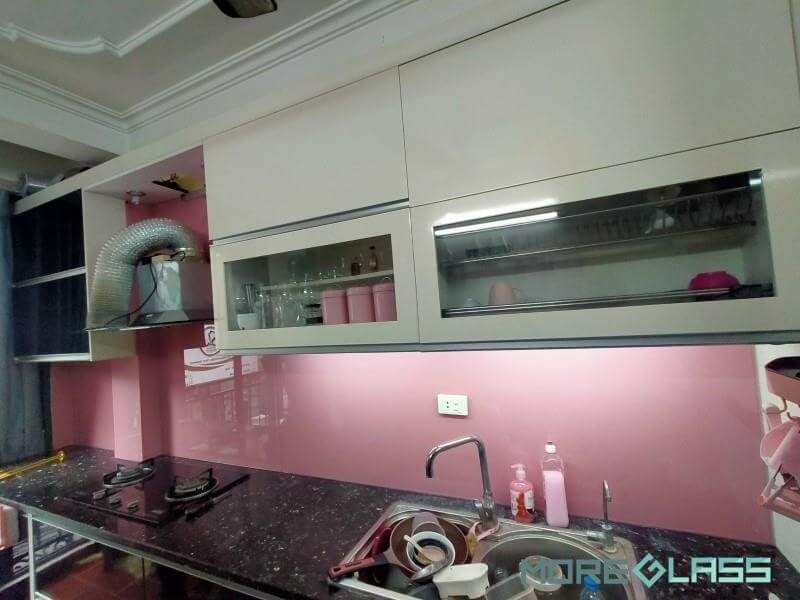 Mẫu phòng bếp phong cách hiện đại cho chung cư, nhà phố với tủ bếp gỗ công nghiêp chống ẩm An Cường cao cấp, mặt bàn đá nhân tạo sang trọng kết hợp kính ốp bếp màu hồng ngọt ngào