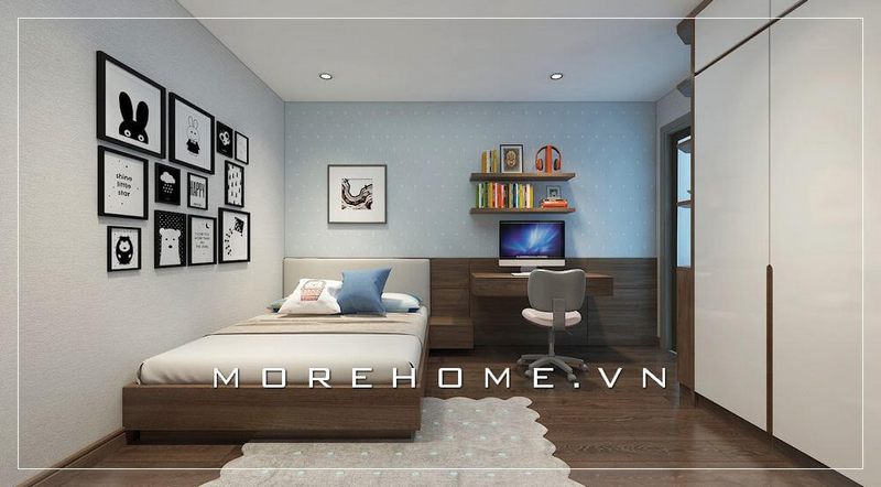 Thiết kế phòng ngủ con trai hiện đại, chiếc giường ngủ đơn hiện đại được bố trí khoa học tạo sự thông thoáng và ngăn nắp nhất cho căn phòng ngủ
