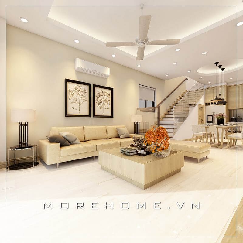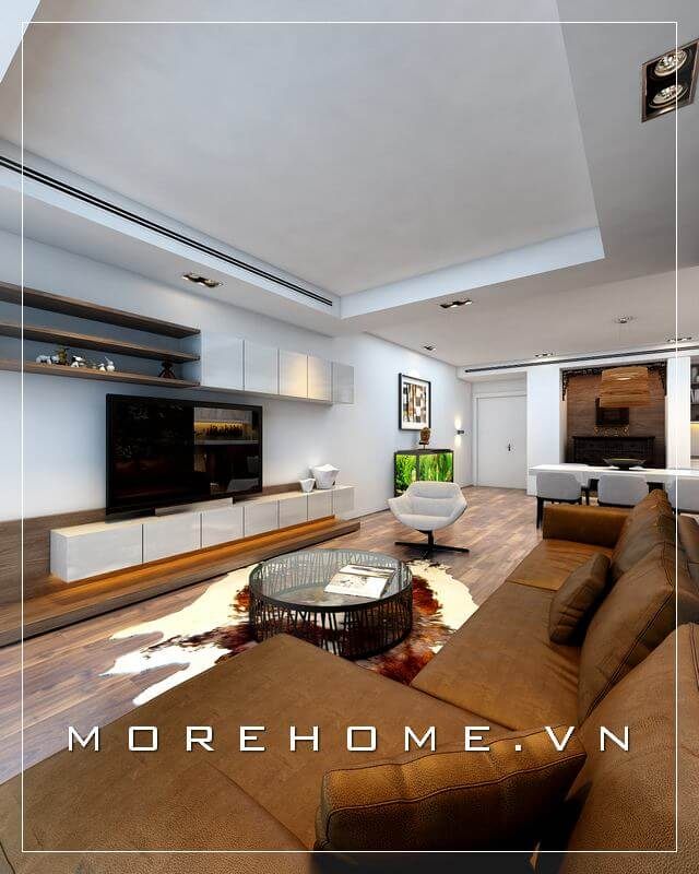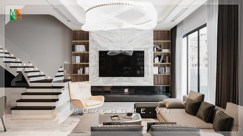 Sự kết hợp giữa 2 tone trắng và nâu để thiết kế không gian nội thất phòng khách đã tạo ra một vẻ đẹp độc đáo và sáng tạo, đồng thời liền mạch trong từng gam màu.