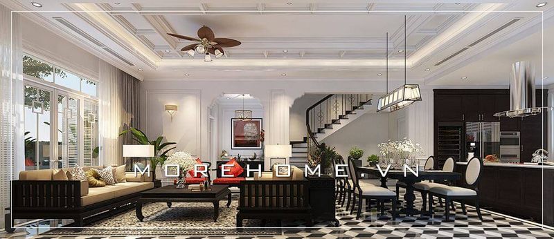 Sofa phòng khách biệt thự được thiết kế theo phong cách tân cổ điển với sự kết hợp giữa gỗ tự nhiên và nhịp nhàng, tạo nên hiệu ứng đẹp mắt.