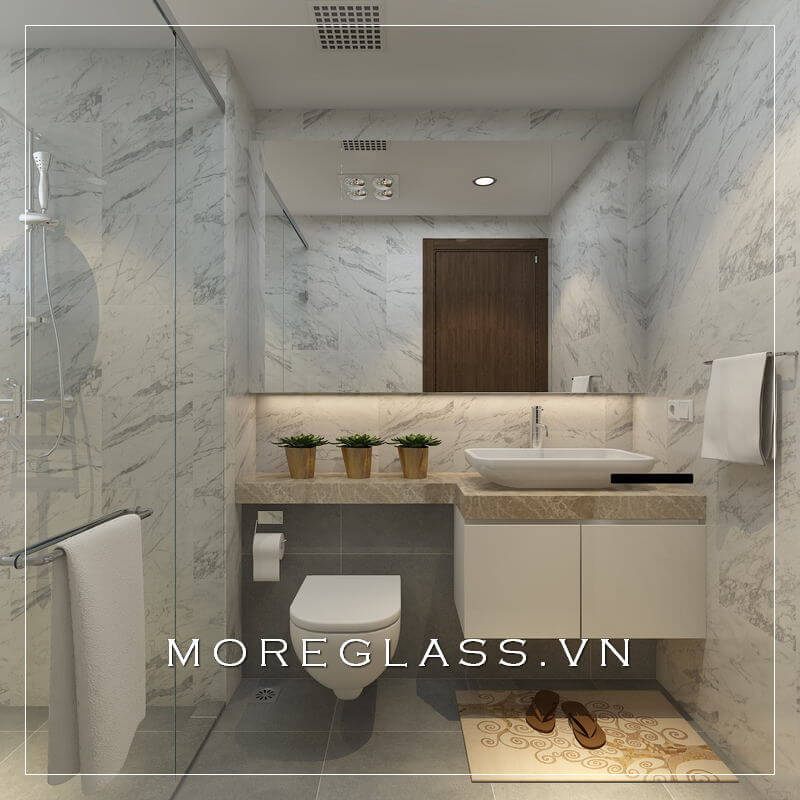 Mẫu nhà vệ sinh hiện đại với nội thất đơn giản, sử dụng gạch ốp tường màu trắng vân mây mang lại sự sang trọng và cuốn hút.