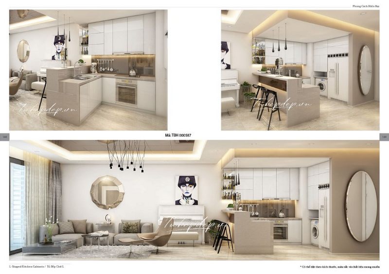 Kiến trúc sư MoreHome đã giới thiệu một mẫu thiết kế nội thất cho phòng bếp liền phòng khách của căn hộ. Hệ thống tủ bếp được chia thành nhiều ngăn để đựng đồ và có quầy bar trẻ trung được kết hợp làm bàn ăn.