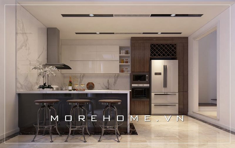 Tủ bếp gỗ công nghiệp màu trắng với thiết kế chữ i hiện đại sẽ làm nên sự đẹp cho phòng bếp của bạn.