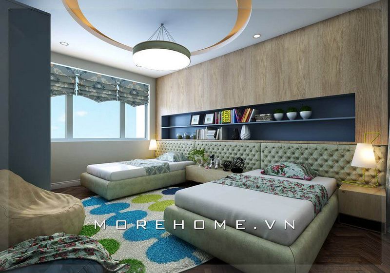 Để tạo nên không gian phòng ngủ hiện đại cho nhà có 2 bé, thiết kế nội thất phòng đôi có một chiếc giường ngủ bọc với nút chần độc đáo để làm nên điểm nhấn ấn tượng cho cả không gian.