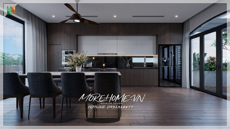 Tủ bếp dưới được làm từ gỗ công nghiệp màu nâu trầm sang trọng, có ngăn tủ cỡ lớn giúp cho việc cất, chứa đồ đạc của người nội trợ trở nên thuận tiện hơn.