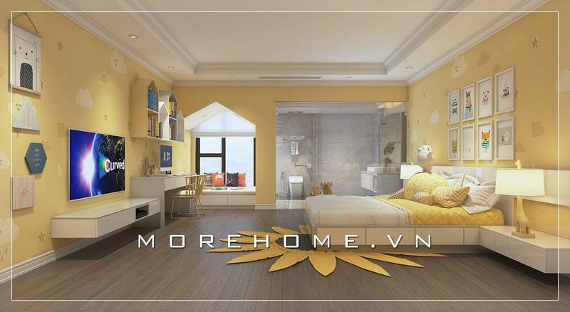 Người ta có thể chiêm ngưỡng một mẫu thiết kế nội thất phòng ngủ hiện đại với màu vàng nhẹ để tạo ra một cảm giác thú vị hơn cho không gian của con trẻ.