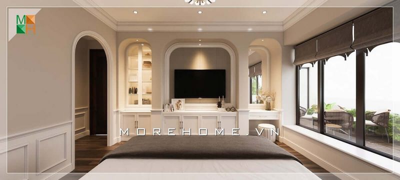 . KTS Morehome đã sáng tạo ra một mẫu thiết kế phòng ngủ phong cách hoàng gia tân cổ điển, sang trọng và đẳng cấp dành cho biệt thự. Thay vì sử dụng kệ tivi như thông thường, hãng đã sử dụng vách ngăn phòng ngủ để treo tivi, giúp không gian phòng ngủ trở nên rộng rãi hơn và không bị quá nặng nề bởi những chi tiết cổ điển.
