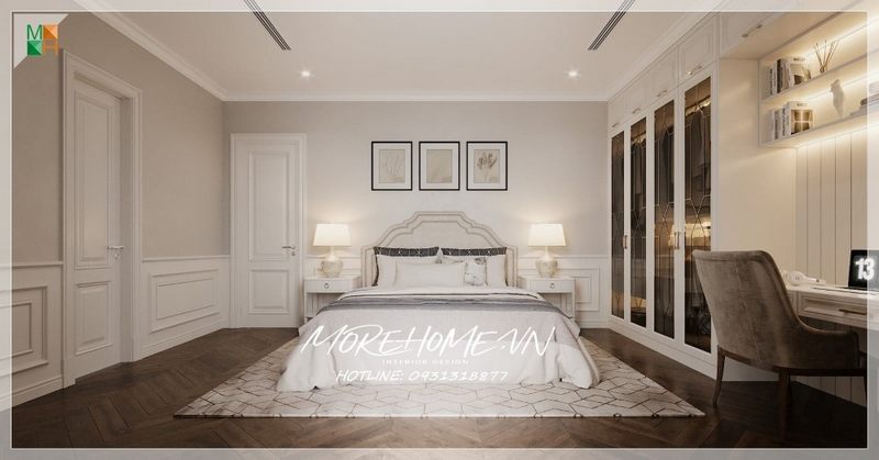Phòng ngủ được thiết kế với bàn làm việc và nội thất gỗ tự nhiên sơn trắng, tạo nên một phong cách đương đại và sang trọng.