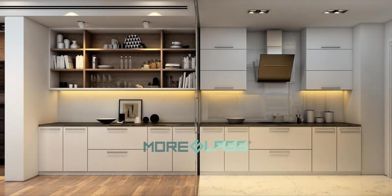 Thiết kế và thi công mẫu kính ốp bếp màu trắng tinh tế cho chung cư, biệt thự, nhà phố.