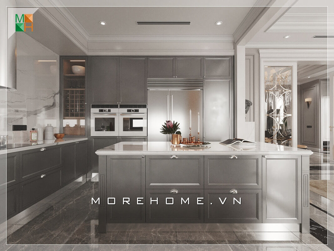 Thiết kế nội thất phòng bếp sử dụng tone màu trắng chủ đạo tạo nên không gian sạch sẽ, sang trọng và tiện nghi cho người nội trợ