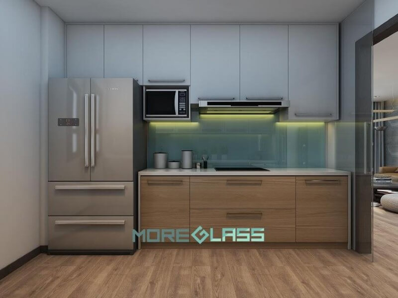 Sắp xếp mẫu kính ốp bếp màu xanh ngọc với không gian phòng bếp nhỏ ở chung cư.